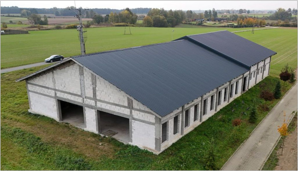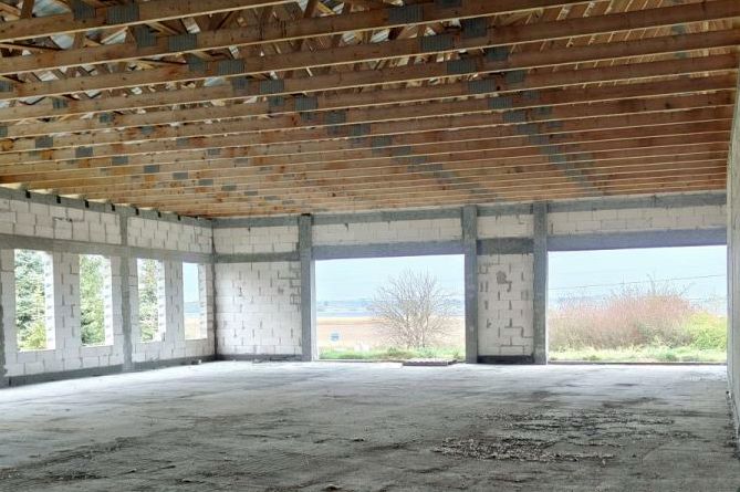 A spacious new build in Wągrowiec with a floor space of 8611 sq/ft, measuring 65 ft x 130 ft on a plot of 1.5 acres, ideal for commercial or workshop use.